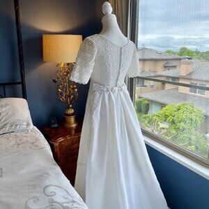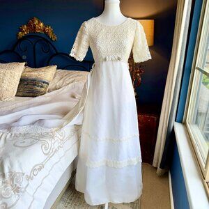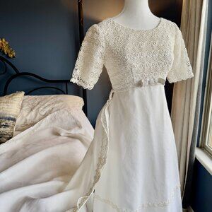 1950s vintage lace wedding dress and removable train, no size but fits like an XS. Very likely handmade or custom made in a boutique. Creamy white, A line skirt with slight empire bodice, lace 1/2 sleeves, lace top, scoop neck, bow at waist. Zips at back, train had lace trim, bows at top, and hooks onto dress. Good vintgae condition, has some marks as shown in photos 10, 11 (small stains), and 12 (larger marks on lace). Bust measures 15.5 inches, waist 13 inches, hips 19 inches, length of dress from top of shoulder to hem is 55 inches. Lined with crinoline, feels like a polyester material. Cat friendly, nonsmoking home.