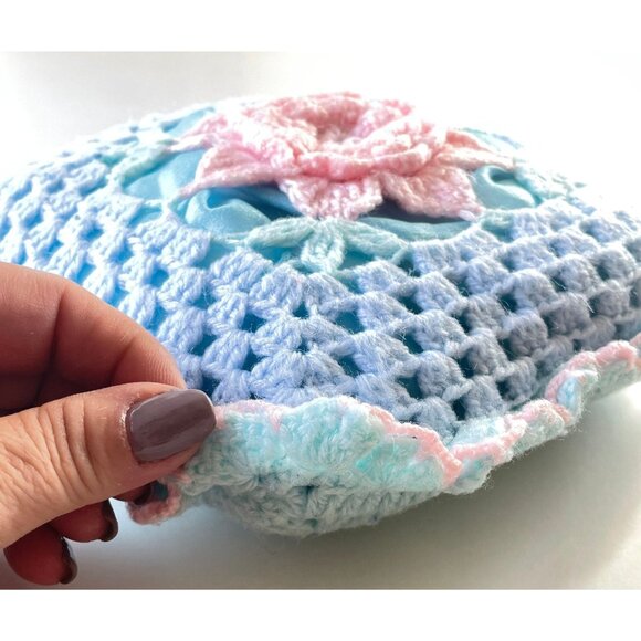 Adorable vintage 1950s crocheted decorative pillow; two different shades of blue, one is baby blue, the other more robin egg blue, with a pink 3D rose on top and pink edge on the ruffle.