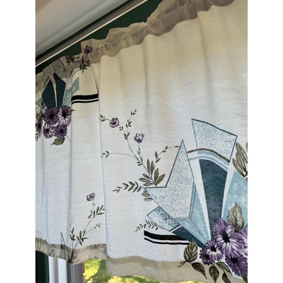 Vintage 1950s curtain, cream, purple blue floral abstract pattern, single panel