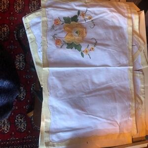 Vintage 1950’s fine Appliqué and Embroidery cotton 4 placemats and napkins- new. Lovely lightweight yellow and white cotton napkin and placemat set for that special occassion. The placemats are 20” by 14” with napkins being 16” square. The work on this is esqusite.