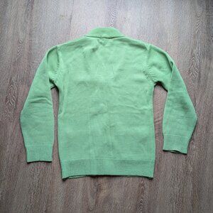 Features: v-neck, pockets on each hip, grandpa style, lace knit pattern down each side of button placket, 100% acrylic, great condition, bakelite buttons.