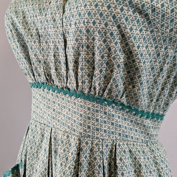 Handmade vintage dress dating to the 1960s. Apron style with customizations to ensure the back doesn't blown open. Ricrac details along neckline, arms, pockets, and waistband. Fully skirt with fitted waist and bodice. In great vintage condition.