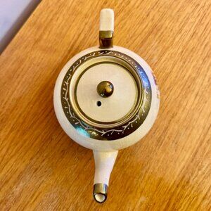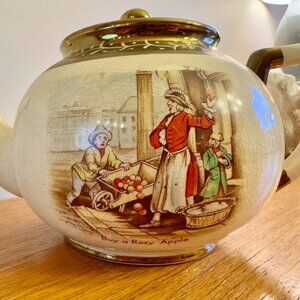 1960s Arthur Wood Old Chelsea Scenes teapot, made in England. One side has an apple street seller scene titled "Buy a Rosy Apple", the other depicts a person selling birds titled "Buy a Fine Singing Bird". Cream coloured with vintage gold trim. Some crazing all over, no damage seen. Length from stem to spout is about 8.75 inches, height about 4.5 inches, opening at top about 3 inches. Cat friendly, nonsmoking home.