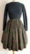 A charming 1960s dress! This skilfully handmade dress features a black fitted top with a round neckline, darted bust and elbows, and a wee slit at each wrist. The skirt is nice and full, pictured here with and without a crinoline (not included) for volume. The fabric of the skirt is an earthy, mossy green, with a jewel toned leaf print. Lovely and autumnal, but with colours that would take you through spring. The dress zips up the back, and closes with a hook and eye at the neck. No tags, but the fabric feels like a shirt weight broadcloth. Please see the measurements for best fit.
