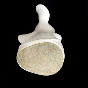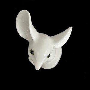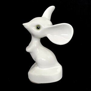 Alfred Dube founded Canadiana Pottery, Ltd. in Ingleside, Ontario after working for Blue Mountain Pottery in Collingwood, Ontario. Many of his pieces reflect his background with BMP, but "The Collectables" series steps away from the multi-coloured drip or Reflow glaze in favour of a smooth white. The bright white makes the green of the plastic eyes pop.