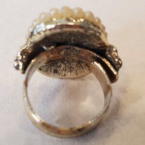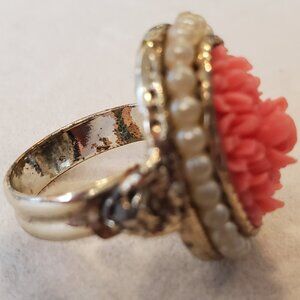 Vintage 1960s Carved Roses Ring Faux Coral & Pearls Adjustable Ornate Goldtone