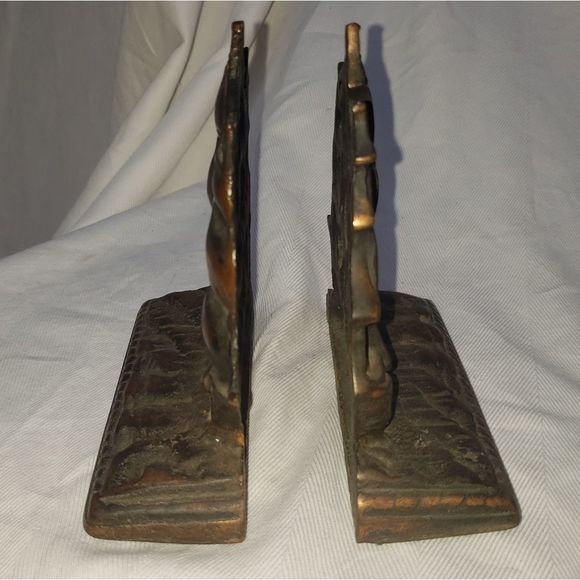 This nice pair of cast iron bookends has a copper wash and were done in the shape of the USS Constitution, aka Old Ironsides, which is marked on the back of each. They retain their original green felt bottoms and are in very good condition with no damage and the color on the copper wash is really nice. They are 5 & 1/2 inches wide, 5 7 3/8 inches high and 2 inches deep. they are ready to hold up some books in your den or library, or to grace a patriotic display