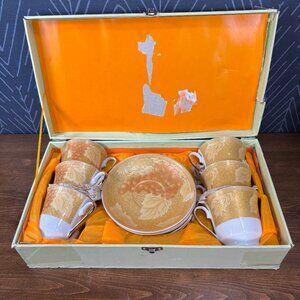 Vintage 1960s China Tea Cup Set with Saucers in Original Box Gold Grape Leaf