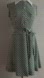 Super cute late 60s, maybe early 70s dress. Dark green with white polka dots, this sleeveless dress has a pointy white collar, moon glow buttons, and a wrap skirt that buttons at the waist and ties at the side. Woven polyester material. An adorable dress! The tag is rather faded, but it does say 100% polyester. No size, please see the measurements for best fit.
