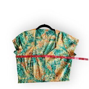 Vintage 1960s/1970s short-sleeve floral housedress in green, orange, and yellow. Perfect for vintage lovers seeking authentic retro style.