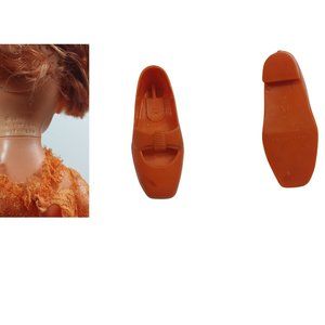 45 cm. Excellent Condition, The Gergous Original orange Lace dress without panties, and 1 missing shoe, made of elastic, Short red rooted hair with long grow in section. The button on front allows hair to grow and retreak. Button is at the back you can winds it back to the disire length. Stunning dark /Black sleep eyes with lashes the book is a little worn but still in good condition.. Please see pics for more detail