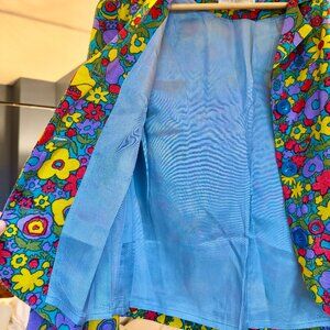 1960s Koret of California flower power pant suit set in excellent used condition. Says size 8 on tag but fits very small like a modern size XXS. Retro mod hippie style floral print featuring purple, yellow, blue, and red. Fitted blazer with tapered leg pants, lined. Union made in Canada. In excellent vintage condition. Cat friendly, nonsmoking home.