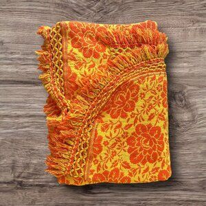 Vintage 1960s Orange & Gold Jacquard Bedspread Fringe Spanish Heavy Coverlet Dbl