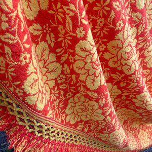 Woven in rich orange and gold jacquard, this heavy-weight coverlet features a rounded edge design and thick fringe on three sides (no fringe at top).