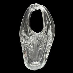 The flowing lines of Pilgrim's crystal basket, catalog #206, bring out the liquidity of glass, especially the two sides where the glass was pulled up and curved to make the handle of the basket, showing as well the Italian feel for glass provided by designer Roberto Moretti.