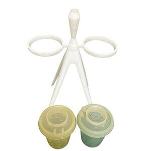 Vintage 1960s Tupperware Plastic Salt and Pepper with Stand, Marked "Tupperware" on the bottom of the shakers.