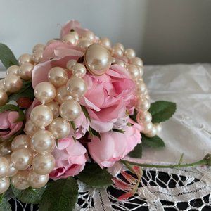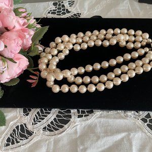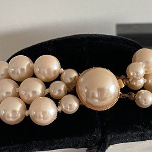 The necklace has a very Breakfast at Tiffany's feel to it. This vintage faux pearl necklace has 3 strands that are hand tied together and attached with a slight twist. The clasp is hidden under a large pearl button. Measuring 17.5" long, a fabulous vintage piece.