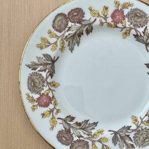 This plate features the gorgeous ""Lichfield"" pattern with pink and gray thistles and yellow leaves and an elegant gold trim around the edge. This pattern was produced by Wedgwood between 1953-1978.