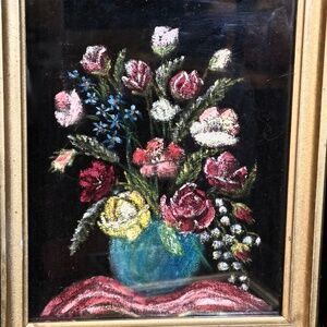 Vintage 1960s bouquet painting on velvet, thick oversized wood framed