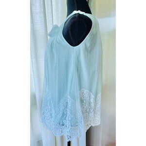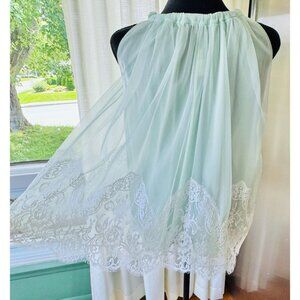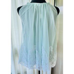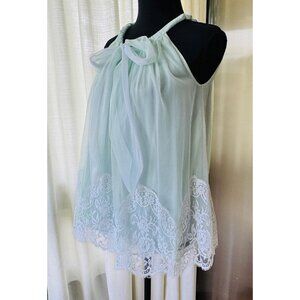 Romantic vintage 1960s babydoll. Sheer soft pastel mint green chiffon, double layered, it has a light and airy look. It has an halter neckline, with a wide bow at the front; it has a A-line silhouette, the bottom has very wide white lace. This slip-on lingerie nightgown is short, would be about hip length. Made in Canada by Linda Underlovelies. Fabric is unknown, likely a nylon or synthetic blend.