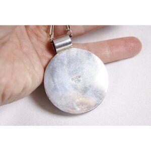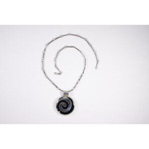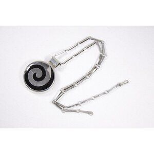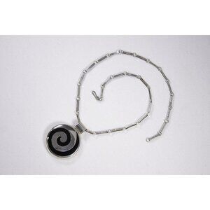 The black area on the spiral looks to be a stone and could be onyx. The large hanging loop makes it easy for a multitude of chains to pass through. It is marked " Mexico 925" on the back. It comes with a flat linked chain (unmarked) on which all the little rings and connections have been soldered shut - a great mark of quality.