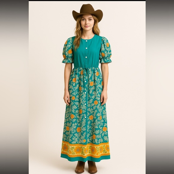 Vintage 1960s floral drawstring button front Maxi Sundress flower power hippie