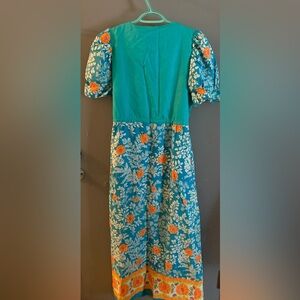 Step into casual elegance with this Hilo Hattie sundress, featuring a vibrant blue hue and charming puff sleeves. The scoop neckline and flowy maxi length make it perfect for resort wear, while the intricate border pattern adds a touch of sophistication.
