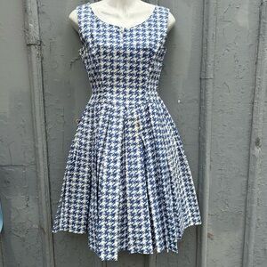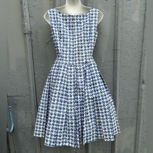 Vintage 1960’s hand made Oversized Houndstooth Patterned Dress & matching jacket. Stunning fit and flare silhouette. Stiff lining that helps emphasize this shape along with detailed pleats. Zippered back entry. Matching button front peplum jacket.