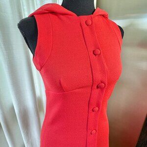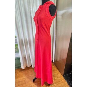 Striking 60s vintage maxi dress. Thick textured knit in a vibrant yet warm cherry red color, this gown has a dramatic oversized hood. Why? why not! Sleeveless, it buttons from the front down to the hips, it is really fitted with a graceful A-Line skirt ending below the ankle. Perfect with very high heels. This is the dress you want to wear at any party!