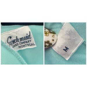 Stunning vintage 1960s Robin Egg blue chiffon peignoir, this robe is open at the front, the silhouette has great flow. The most striking feature is the wide white lace at the bust and cuffs, with double drawstrings ties at the top. Gown is double layered and ankle length. Made by French Maid in Canada, material is likely nylon.