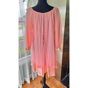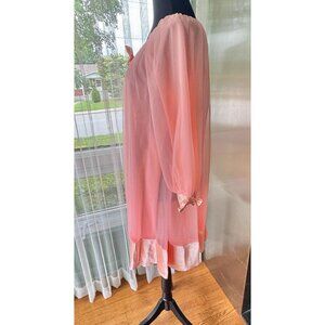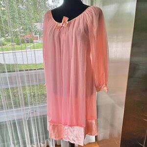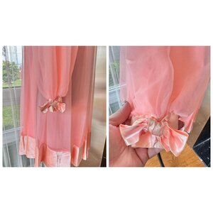 Stunning vintage 1960s pink chiffon peignoir. Gorgeous coral color, this nightie is double layered, with very wide satin trim at the hem; same satin trim and ribbon at the cuffs and a bow at the neckline. It opens from the back and has an inside tie to adjust to comfort; the silhouette has great flow. Although it is a best fit for a medium size 8, it is meant to be roomy and loose and would also fit a wider range of size, from Small to Large. This robe length is just above the knee. Made in Canada by Linda Underlovelies.