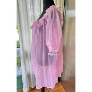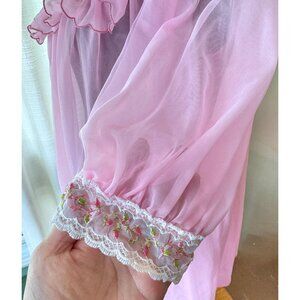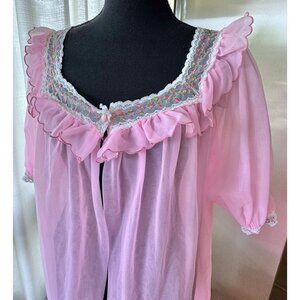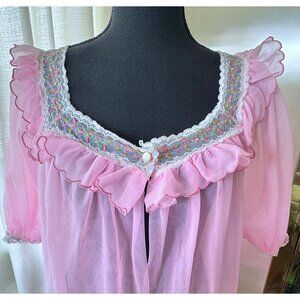 Adorable vintage 1960s peignoir, sheer pink, delicate floral embroidery at the neckline and sleeves' trim. Neckline is square and ruffled. This robe is open at the front, closes with a single button. It is longer on the front and shorter on the back, just above the knee. Made in USA by Slumber Suzy Dreamwear. Material is likely nylon.