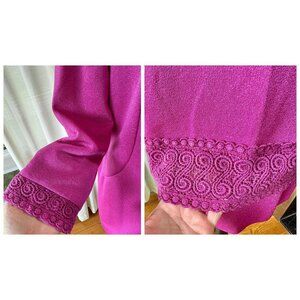 Stunning 1960s vintage two-pieces set. Made by Lawrence Dress original, the set includes a straight sleeveless dress with a boat neckline, zipping down the back, and a matching open front long sleeves jacket, with the same trim at the collar and cuffs. The jacket has a single hook-and-eye at the top. The color is magenta (or fuchsia), vibrant and classic. The dress is partially lined, the jacket is fully lined. Both are above mid-thigh, almost mini length. This set is simply remarkable, very Jackie O vibes! Perfect cocktail or special occasion outfit.