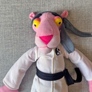 classic Pink Panther collectible Nanco plush, 18 inches. Decked in his Karate outfit from the beloved movie series, this plush is a vibrant pink, with a white Karate outfit with Yin Yang symbol.