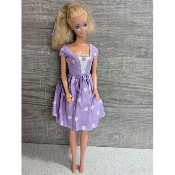 12" tall blonde, blue eyed Barbie in purple dress/no shoes.