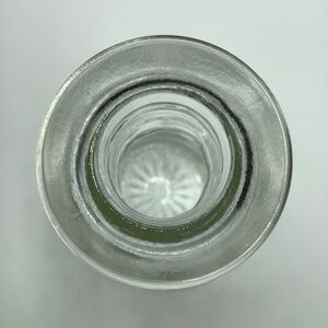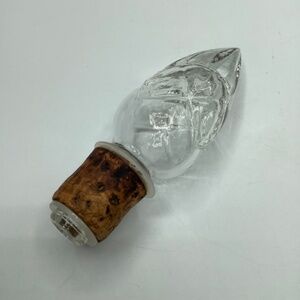 Decanter (21 cm); pressed glass with cork stopper. Decanter is tear drop shaped and adorned with an embossed repeating diamond pattern. Stopper (10.5 cm) is also adorned with an embossed repeating diamond pattern. The embossed base reads "London Winery Limited / Rd. 1967 / London Ontario Canada"