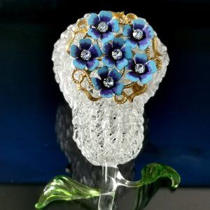 Blue forget-me-not flowers with purple centre and clear rhinestones on a filigree gold tone base.