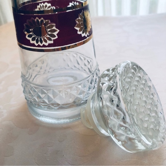 Vintage 1970 Retro Glass Bar Decanter with Burgundy/Gold Flower Band and Stopper