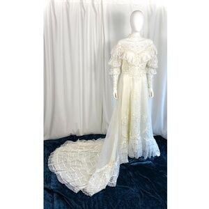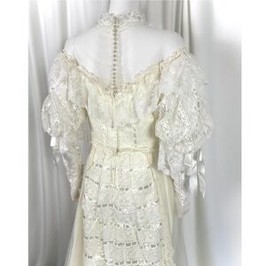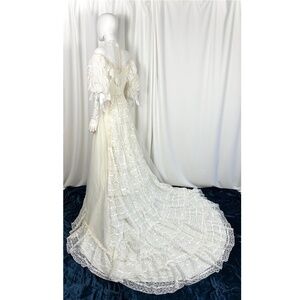 Vintage 1970’s 1980’s Alfred Angelo Lace Wedding Dress • Peasant Long Sleeve • Lace Ruffle Trim • Mesh • Beading • Pearl Buttons • Ribbons