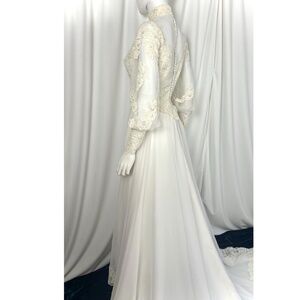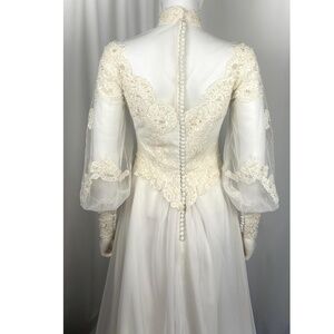 Vintage 1970’s 1980’s Ivory + Cream Lace Mock Neck Wedding Dress • Mesh • Sequins • Beading • Puffy Peasant Long Sleeve • Chiffon • Buttons • Custom Made