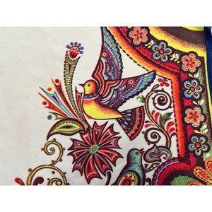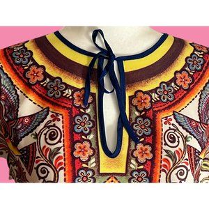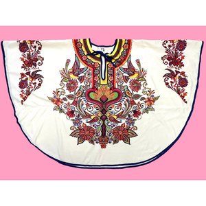 This cute top is pure 1970's! Think Partridge Family! It is a fluttery cape or poncho style top with a tie at the neckline. It is a knit polyester material in cream white with screenprinted birds, flowers, and medallions. There are seams sewn in to give it some structure and cinch it in a bit at the midsection. Sold by Sears as part of their Sleep Shop at home wear collection. There is royal blue piping all the way around. Back side is plain with no design.