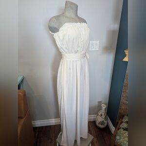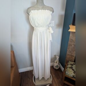 This elegant white strapless maxi dress is perfect for any occasion. The dress features a flattering silhouette and a stylish tie waist.