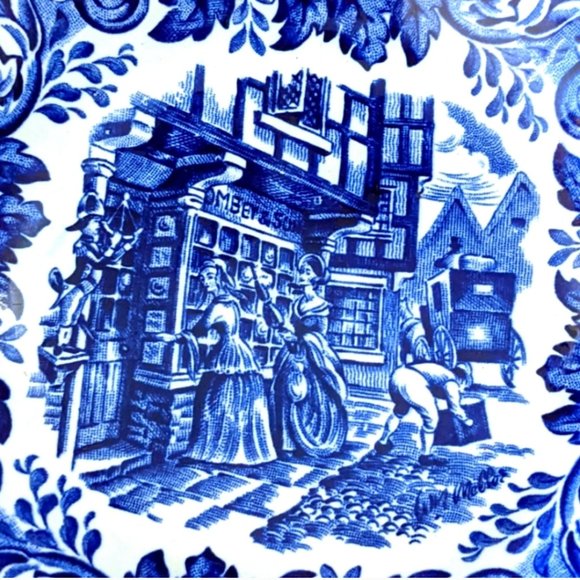 This absolutely gorgeous bowl from English Ironstone Tableware Ltd. is hand engraved with a scene from Dickens. Part of a larger set, the Dickens series was highly collectible when it was released.