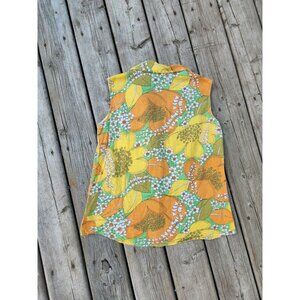 Vintage 1970s Floral Linen Button Up Sleeveless Tank Womens L/XL.
