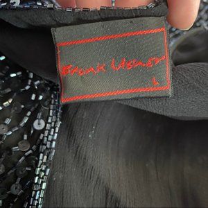 A beaded evening top on silk - dating from 1970s.Made by Frank Usher and labeled 100% pure silk shell. The fine black top is covered all over with rich beading and sequins in black- but sparkle shades of blue and green in the light. This is fabulous quality top with heavy glass beading and sequinsHas shoulder pads