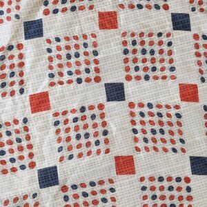 Features: Semi-sheer white fabric (some sort of synthetic) with navy and orange-red polka dot and square geometric pattern; navy blue border around edges