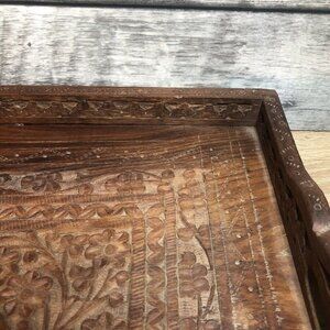 Vintage 1970’s Hand Carved Wooden Embossed Made In India Tray With Handles (ts)