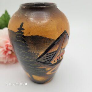 Vintage 1970s Handarbeit German Black Forest Hand Carved Painted Wood Vase 4 In