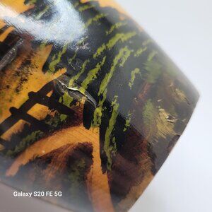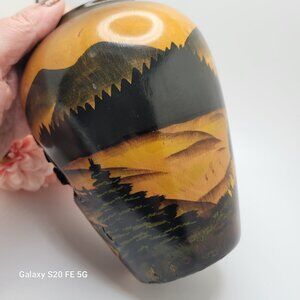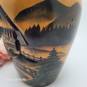 Vintage 1970s Handarbeit German Black Forest Hand Carved Painted Wood Vase 7 In