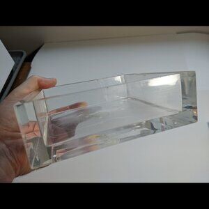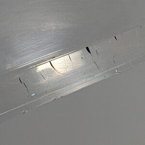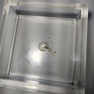 Fine scratches on the metal. Plexiglass part has small cracks along some of the inner edges, as well as fine scratches throughout. Inner bottom has some melted spots and staining. Slight staining along the inner edges. Sold as-is.